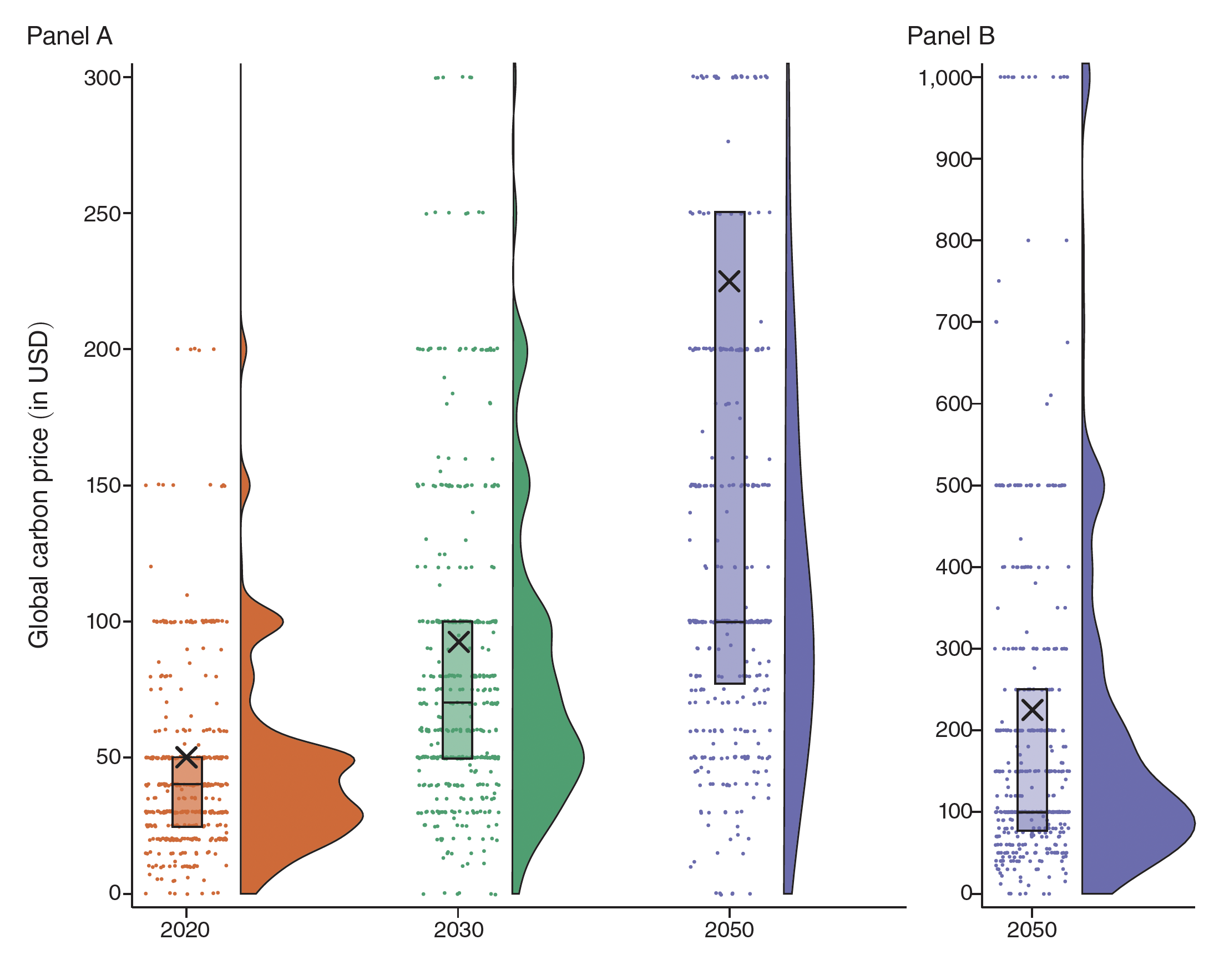 A recent survey of carbon pricing academics asked them to choose a uniform global carbon price, assuming that a “world government” exists and seeks to “maximise the well-being of all present and future people.” Their median response was ~$75 per tonne of CO2 in 2030, rising to $100 per tonne of CO2 in 2050. This broadly tallies with the 2017 High-Level Commission on Carbon Prices (HLCCP), which concluded that carbon prices needed to reach $50-100 per tonne CO2e by 2030, in order to limit global temperature rises to well below 2ºC.1