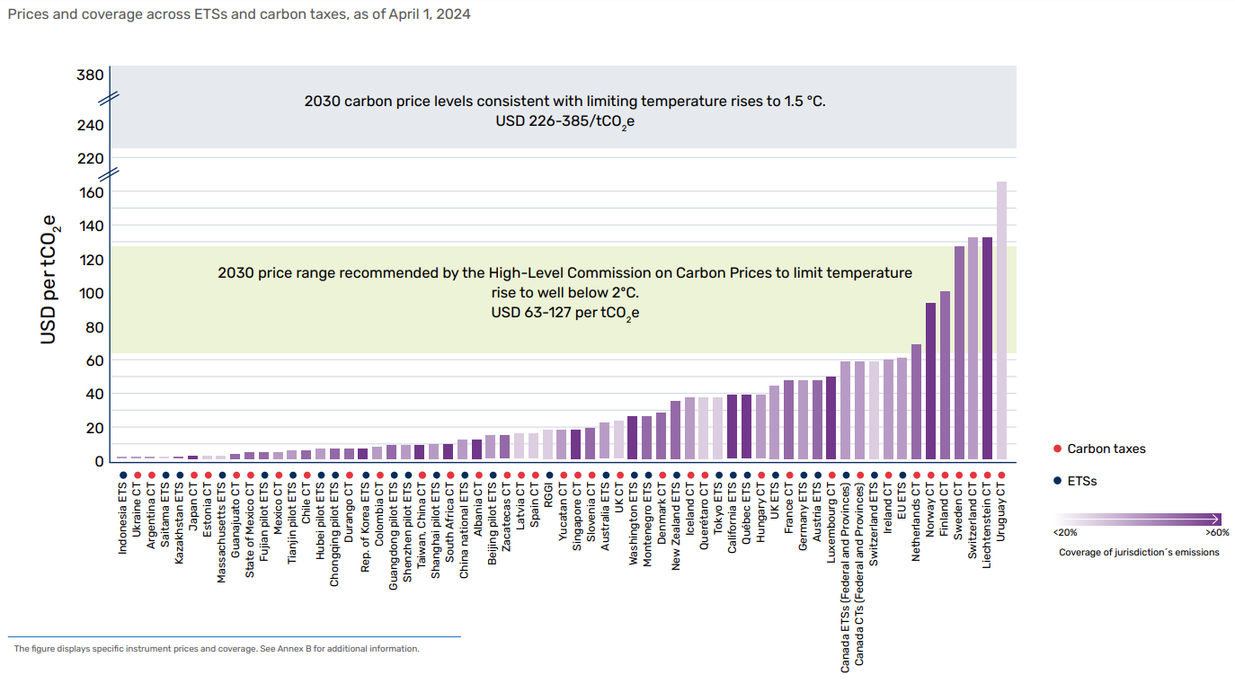 Only seven carbon pricing instruments, covering less than 1% of global greenhouse gas (GHG) emissions, reached price levels at or above the inflation-adjusted minimum level of $63 (€60) per tonne CO2e in 2024 suggested by the HLCCP. Incidentally, the ETS with the highest price represented in the chart below - the EU ETS - failed to meet even this minimum level, at least in April 2024 when the snapshot of prices for the chart below was taken. Many European countries also have a separate carbon tax - some overlap with the ETS, but most do not - but even these tend to be in the $20-$60 per tonne range.