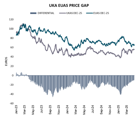 At the beginning of the year the UK-EU discount stood at 50%. The perception that the chances of a reproachment between the UK and the EU were fading, coupled with delays to the UK ETS reform process, sent the UKA price down to a record low of £31.54 (€37.35) per tonne (see Britain's green credibility gap: UK carbon price slumps to record low, 50% below the EU).