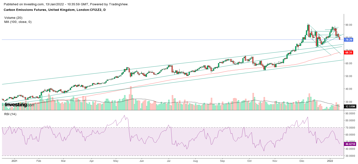 The Dec-2022 EU carbon futures contract is now back below the key €80 per tonne level. Carbon is back to where it was two weeks ago. On the face of it that doesn’t sound like much to worry about. But delve deeper and the carbon market might be set for an extended stay in the 70’s, or even lower.
