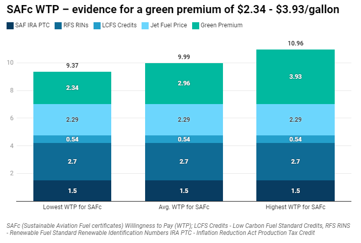 RMI and the Mission Possible Partnership (MPP) conducted a survey of 23 companies (including airlines and logistics service providers, and corporate customers), and examined their willingness to pay for SAF and SAFc. The average price the airline industry was willing to pay for SAF was $6 per gallon, three times the current jet fuel price. Meanwhile, analysis of corporate demand for SAFc indicates a green premium in the range of $2.34 - $3.93 per gallon.3