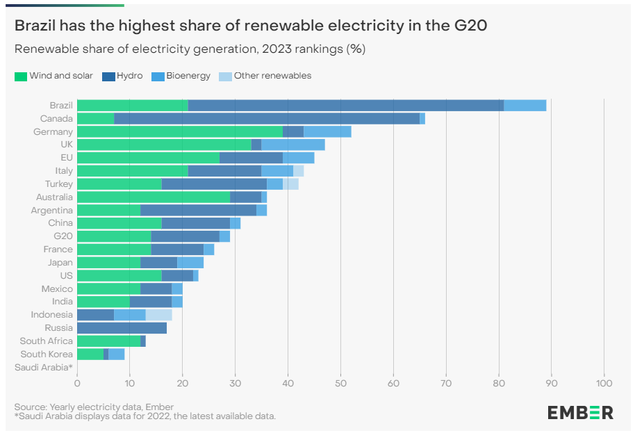 Only around a quarter of the emissions produced in Brazil will be covered by the carbon market, primarily from the oil & gas sector, but also other carbon intensive industries such as cement, iron and steel, and aluminium. In contrast to the EU ETS and other compliance schemes, Brazil has little need to rely on carbon markets to price out fossil fuel power generation. It already has the highest share of renewable energy in the G20 (89%) by virtue of its hydroelectric resources and more recent investments in solar and wind capacity.