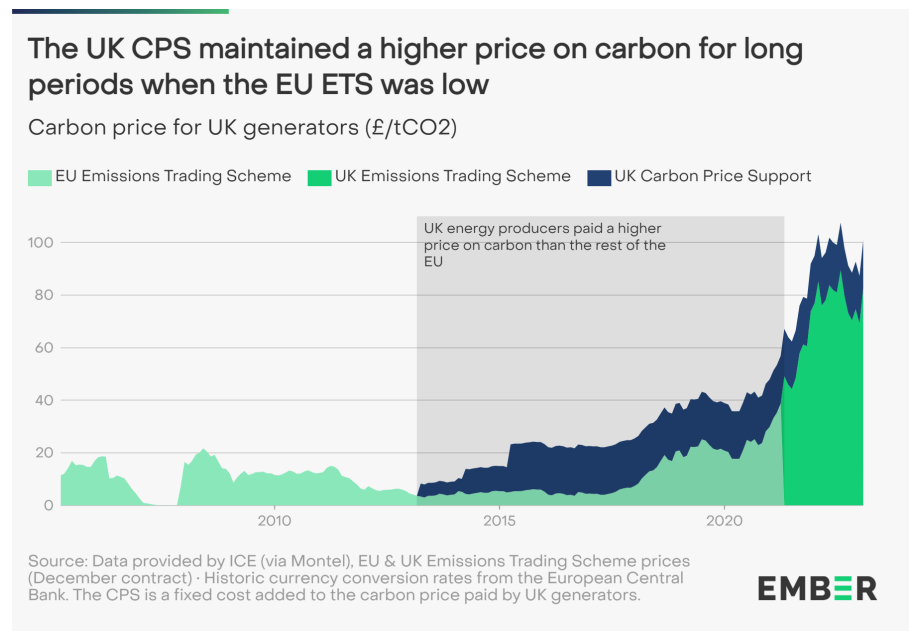 The over-riding conclusion was that the carbon price was too low and too unstable if the UK was ever to meet the requirements of the 2008 Climate Change Act. In response, the government announced in 2011 that a top-up carbon tax levied on power generators would be introduced, payable in addition to the prevailing EU ETS carbon price. The Carbon Price Support (CPS) as its known was launched in 2013 at £5 per tonne, it rose to £9 per tonne CO2 in 2014, and then finally to £18 per tonne in April 2015. In response to concerns over UK industry competitiveness the CPS was frozen at £18 per tonne.