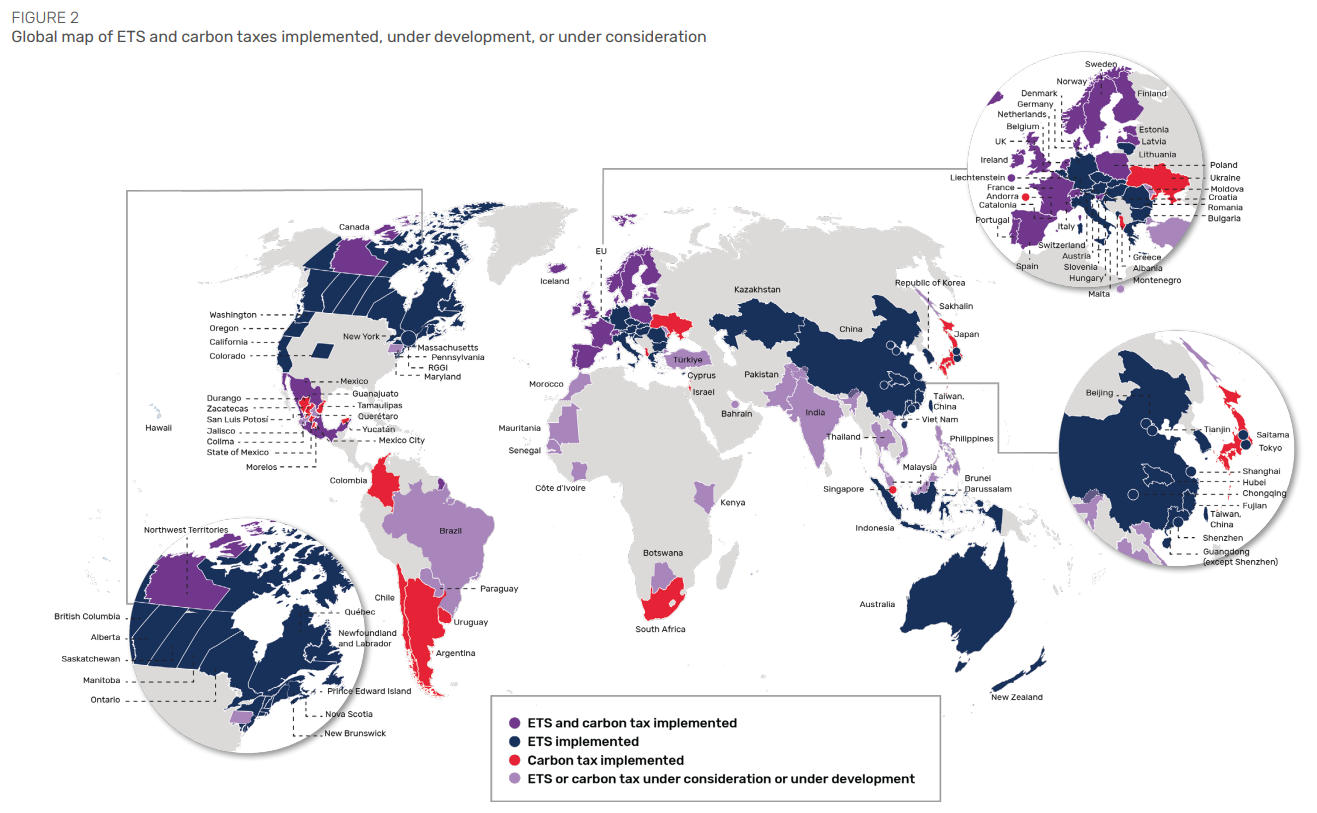 Direct carbon pricing covers approximately 28% of global GHG emissions, up from 24% in 2024. There are now 80 direct carbon pricing instruments in operation around the world; 37 emissions trading systems and 43 carbon taxes.