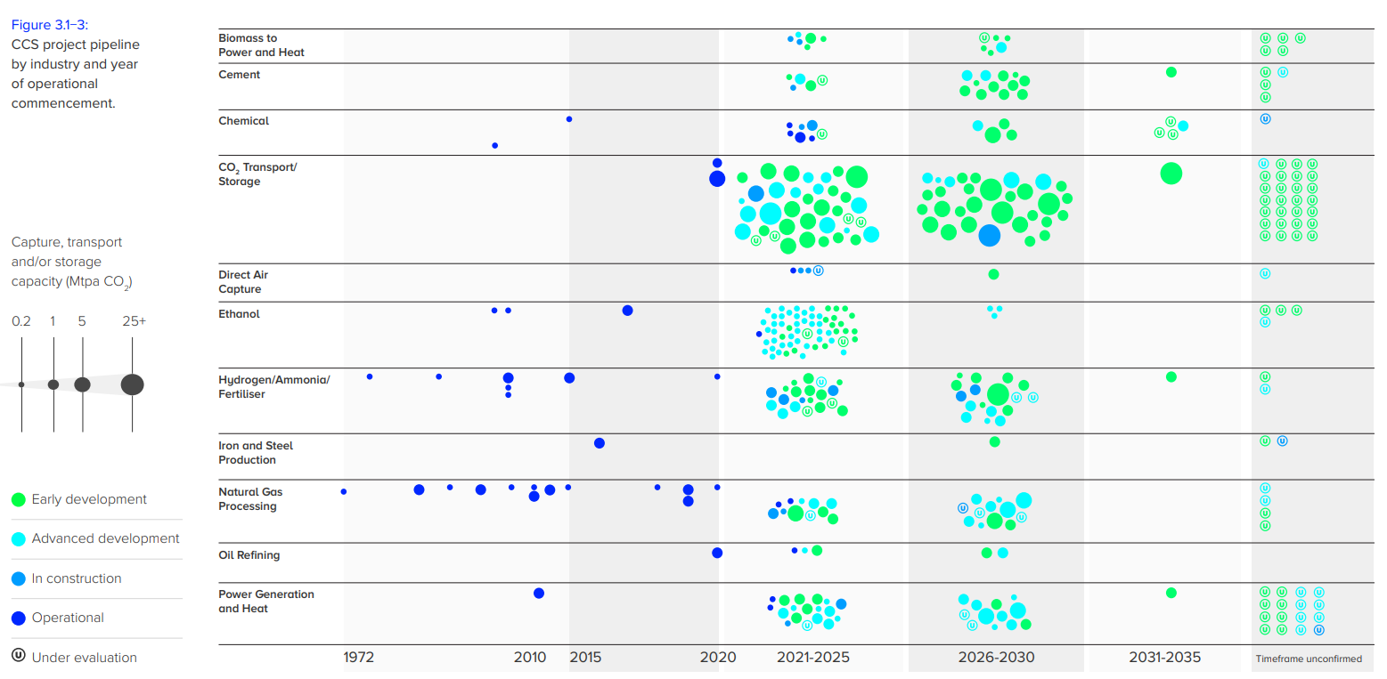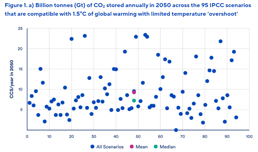 Remember, keeping global temperature increases within 1.5°C will depend on a massive expansion in CCS. Looking across 95 IPCC scenarios compatible with this climate target reveals a significant variation in the call on CCS by 2050, ranging from zero (one scenario) to almost 25 Gt per annum. The average is close to 10 Gt per annum.