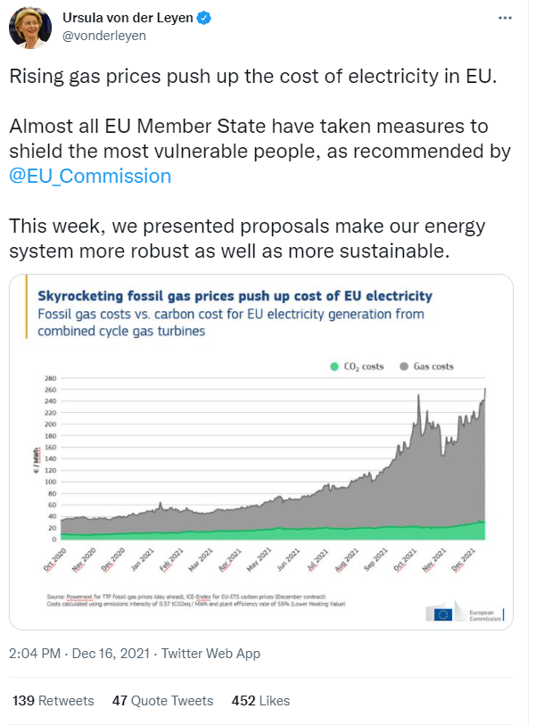 President of the EU Commission, Ursula von der Leyen underpinned this commitment by tweeting this chart below showing that carbon has played only a minor role in the face of higher electricity prices in comparison with natural gas, while also highlighting the measures that member states have taken to shield vulnerable people from higher costs. Note that the latter is only possible because of money generated through carbon allowance auctions.