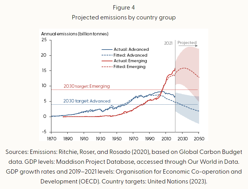 Over the past 30 years, carbon intensity in advanced economies (and to a lesser extent in emerging economies) has diverged (to the upside) from what the bell-curve formation would suggest. This isn’t necessarily something to be concerned about. As the historical data shows, there have been some notable departures from the trend in the past, with carbon intensity subsequently returning to the long-term fitted line of the bell-curve. Nevertheless, FRBSF’s analysis indicates that advanced economies need to play catch-up if they are to return to the bell-curve, and go on to hit their 2030 emission reduction targets. Emerging economies face an even smaller chance of achieving their announced targets, even if they follow the bell-curve. Indeed, the analysis indicates that for this latter group, emissions will still continue to grow and perhaps only peak in 2030 or soon after.