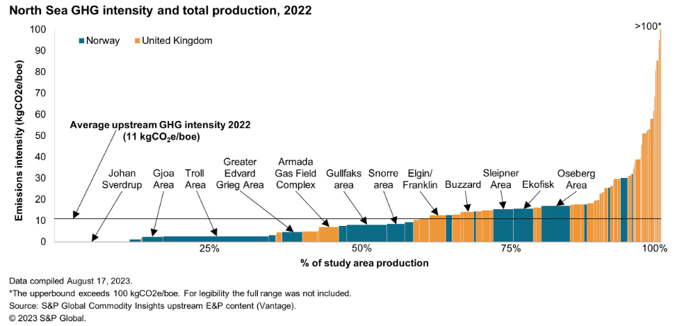 This second chart from S&P Global illustrates the difference in Scope 1 GHG emissions intensity across production hubs in the North Sea (primarily the UK and Norway). Over 60% of crude production from the basin has a carbon intensity of 10 kgs CO2e per barrel or less. However, similar to the variation on a global basis, the most carbon intensive hubs emit 10x or more GHG emissions as the least carbon intensive.