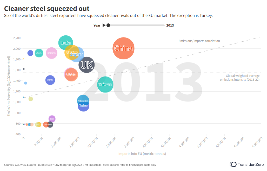 As the chart below illustrates, high carbon intensive steel can push low carbon intensive competition out of the market, especially if they have a cost advantage. Between 2013 and 2022, the carbon intensity of EU steel imports became progressively higher as supplies from China, South Korea, Russia, India, and Ukraine pushed low carbon intensive exporters such as Brazil and Taiwan, out of the market.
