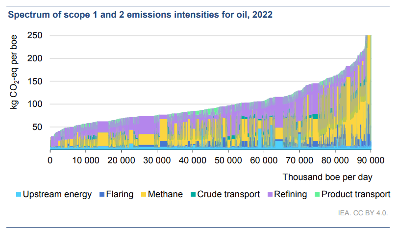 Although people tend to use a standard carbon intensity to measure the overall emissions associated with a particular activity, the average hides a broad range of carbon emissions. For example, the carbon intensity of crude oil production varies significantly between countries, but even on a local basis, the carbon intensity can also differ dramatically. The chart below from the International Energy Agency (IEA) shows the global range of carbon intensity for crude oil, by production (Scope 1 and 2), by activity, during 2022. Production of the crudes on the far right of the chart are responsible for ~10 times as much carbon per barrel as those on the far left.1