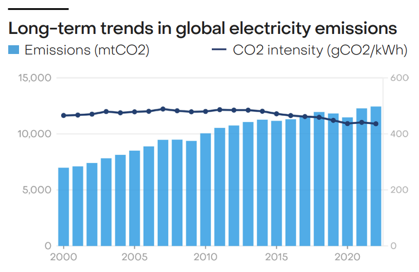 Global carbon emissions associated with generating electricity have doubled since 2000 to 12.4 Gt CO2 in 2022, according to Ember. Around 70% of the growth in emissions has been due to urbanisation and industrialisation in China, spurring rapid demand growth for electricity. Countries with the most carbon intensive electricity generation, such as South Africa and Mongolia, are of course heavily reliant on thermal coal.2