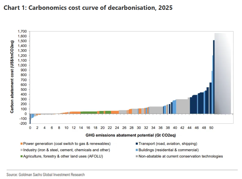 In late 2019, Goldman Sachs (GS) published their first estimate of the marginal abatement cost (MAC) curve for carbon. The Carbonomics cost curve as the bank calls it, shows the reduction potential for anthropogenic greenhouse gas emissions based on over 100 different technologies.