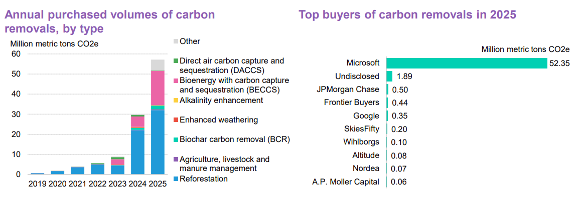 In 2025 the tech giant purchased 52 million CDR credits in 2025 (93% of the carbon removal market), according to data published in the Sustainable Energy in America 2026 Factbook. Almost all (96%) of the CDR volume was contracted via long-term offtake contracts (typically 10–15 years) whereby the buyer commits to purchasing a specific volume of future CDR credits.