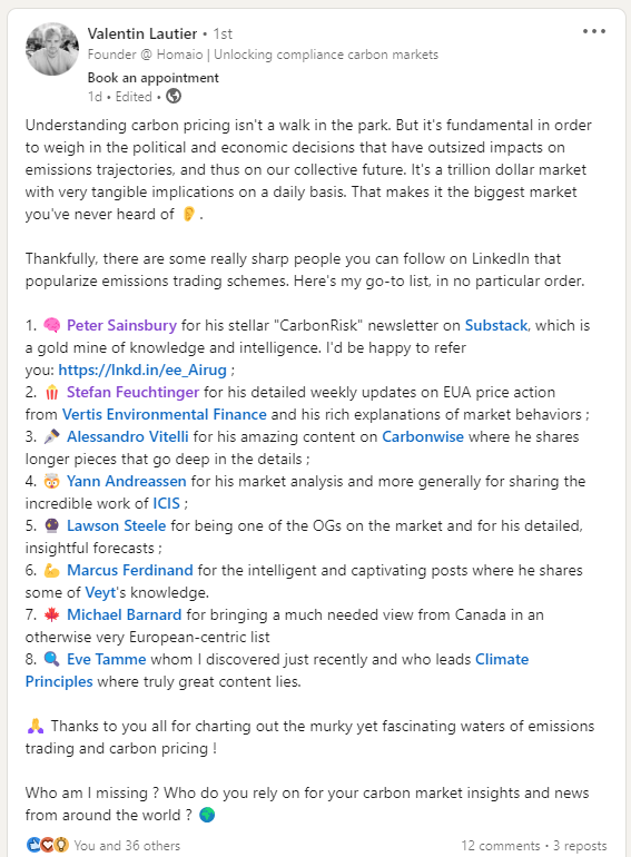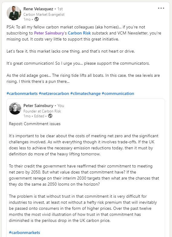 I read hundreds of articles, capture loads of charts and pictures, listen to several podcasts a week to learn what experts are thinking, and brainstorm reams of article ideas. But when I click publish I really have no idea how my latest incarnation will be received. So when I get nice messages like the ones below from smart, knowledgeable people doing great things in carbon markets, I know I’m on the right path.