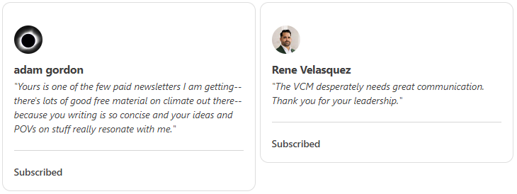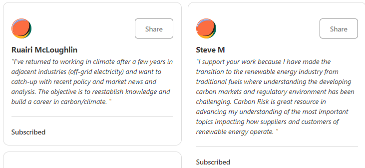 In June I launched the Carbon Risk referral program. When you use the referral link below, or the “Share” button on any of my articles, you'll get credit (a complementary paid subscription to Carbon Risk) for any new subscribers you bring to the newsletter - either free or paid. Simply send the link in a text, email, or share it on social media with your friends and colleagues.