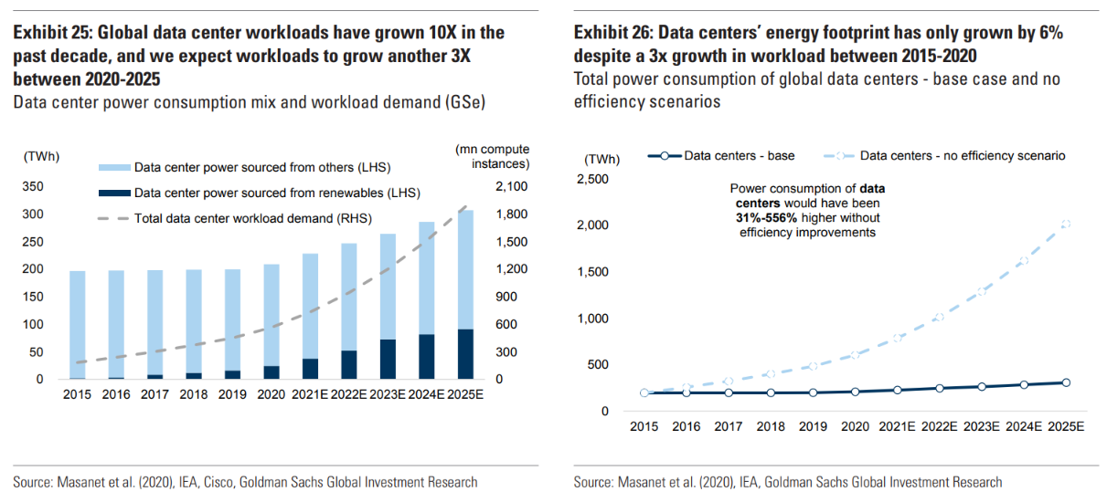 According to Goldman Sachs, data centre workloads are projected to rise by another 3X between 2020 and 2025. It might be more difficult to get the same improvement in efficiency over the next few years. The bank expects a significant jump in power demand (~50%) between 2020 and 2025 to 300-350 TWh, but that’s still clearly much less than the increase in data centre workload.1