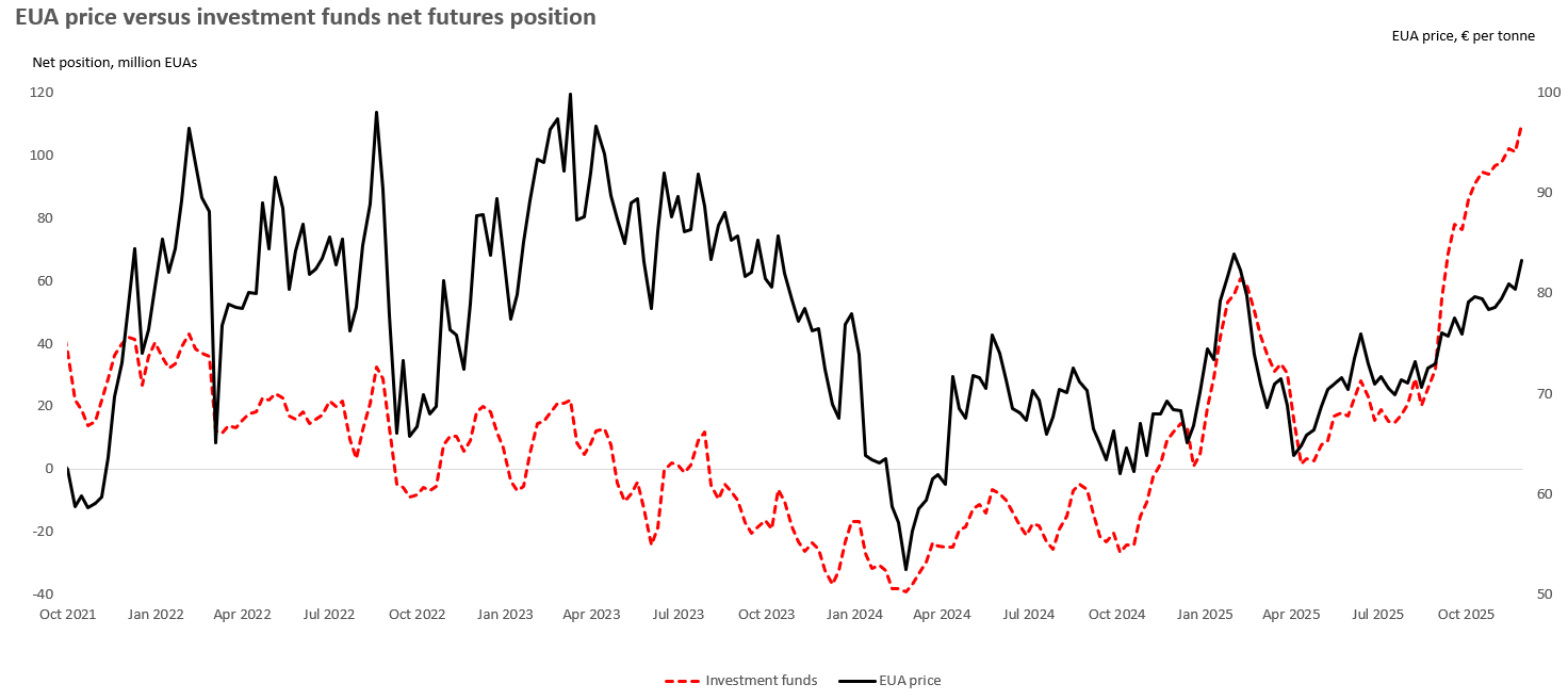 What it does indicate is that funds with a large long position on their balance sheet are happy to hold (and even add to their positions at opportune moments), betting that the structural deficit in EUAs (supply is expected to decline by 21% in 2026 alone) will be enough to drive prices even higher into 2026.