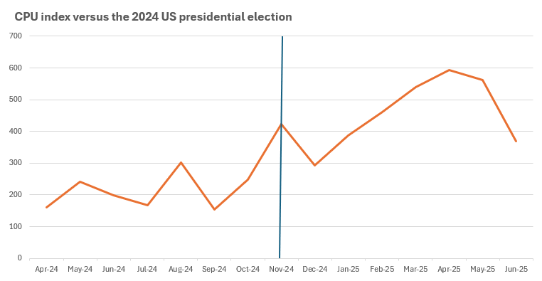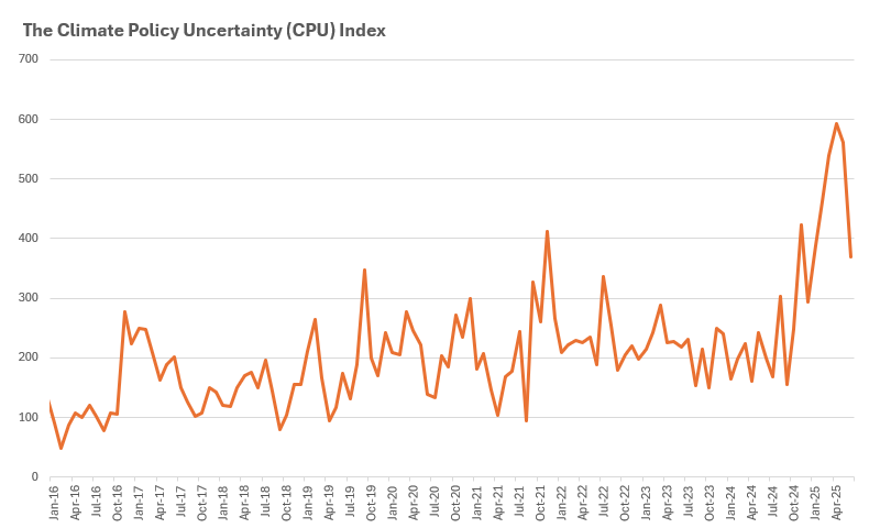 It’s no surprise that climate policy uncertainty tends to spike around the US presidential election cycle, but has this time been any different? Despite everything the CPU index shows that US climate policy uncertainty has broadly followed the same path as previous elections, albeit with a more pronounced spike in uncertainty post election, and peaking one month later, in April 2025.4