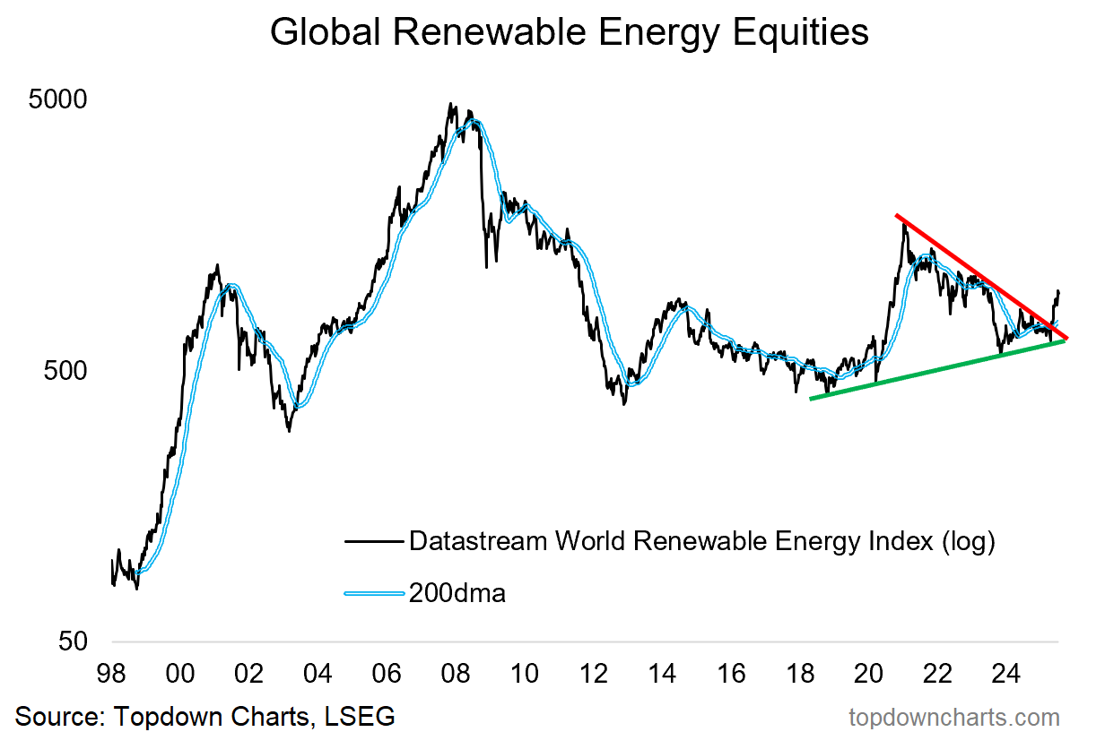 The past four years have been brutal for renewable energy equities as higher interest rates and cost pressures took their toll while the sector fell out of favour with investors. However, unbeknownst to many quick to dismiss the sector as un-investable, the chart below from shows a market that has been building a large technical pattern, one that was primed to break-out in 2025. Despite all the climate policy uncertainty headwinds the market has broken out of this pattern to the upside over the past few months, and is now up some 20% since April. Perhaps, to paraphrase Buffett’s words, investors have looked upon the upsurge in uncertainty as a friend offering the gift of long-term value.