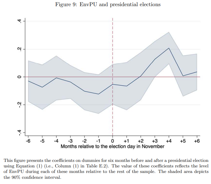Notable as they are, the most important drivers of climate policy uncertainty in America is the election cycle. To determine how significant, analysts at the Geneva Graduate Institute (IHEID) in Switzerland constructed a similar, albeit slightly more sophisticated index of climate policy uncertainty and then cross-matched it with the 6-month period leading up to and following the previous nine US presidential elections.
