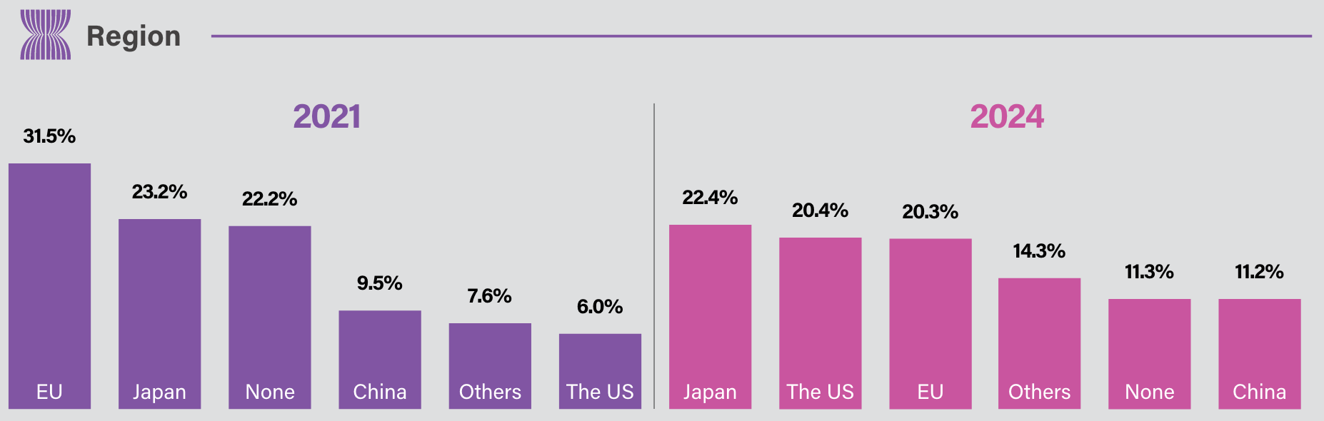 Perhaps surprisingly, the country that ranked first was Japan (22.4%). The United States was in second place (20.4%), followed by the EU (20.3%), with China lagging much further behind (11.2%). The results are a remarkable turnaround from 2021 when the EU was seen as the clear leader.