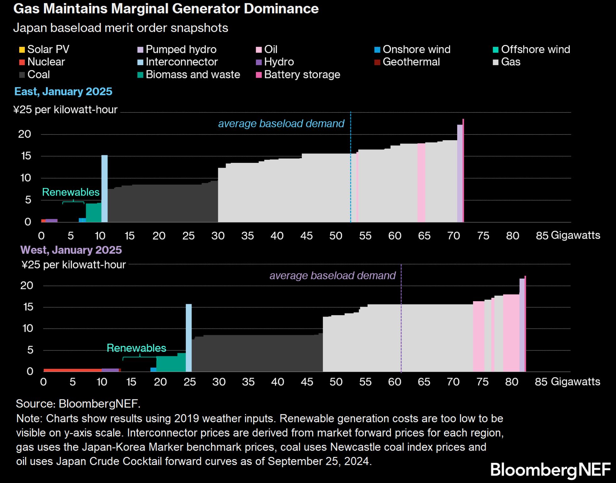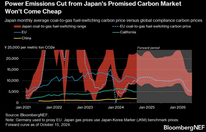 BNEF estimates that Japan would need a carbon price of at least ¥10,000 (€62) per tonne of CO2 to incentivise a shift away from thermal coal and towards natural gas. The high price of gas in Japan, coupled with the relative high efficiency of its coal-fired generation units, means that a high carbon price is required.