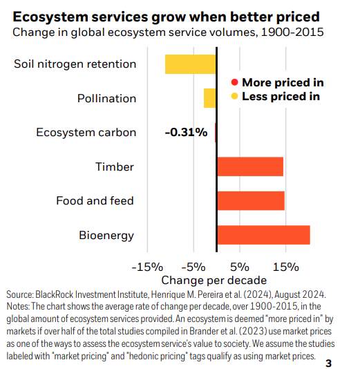 “BlackRock research shows that only a portion of natural capital’s value to the economy is priced into markets today. This analysis suggests asset prices could adjust to better reflect both the risks and opportunities linked to natural capital, driven in large part by increasing physical risks.”