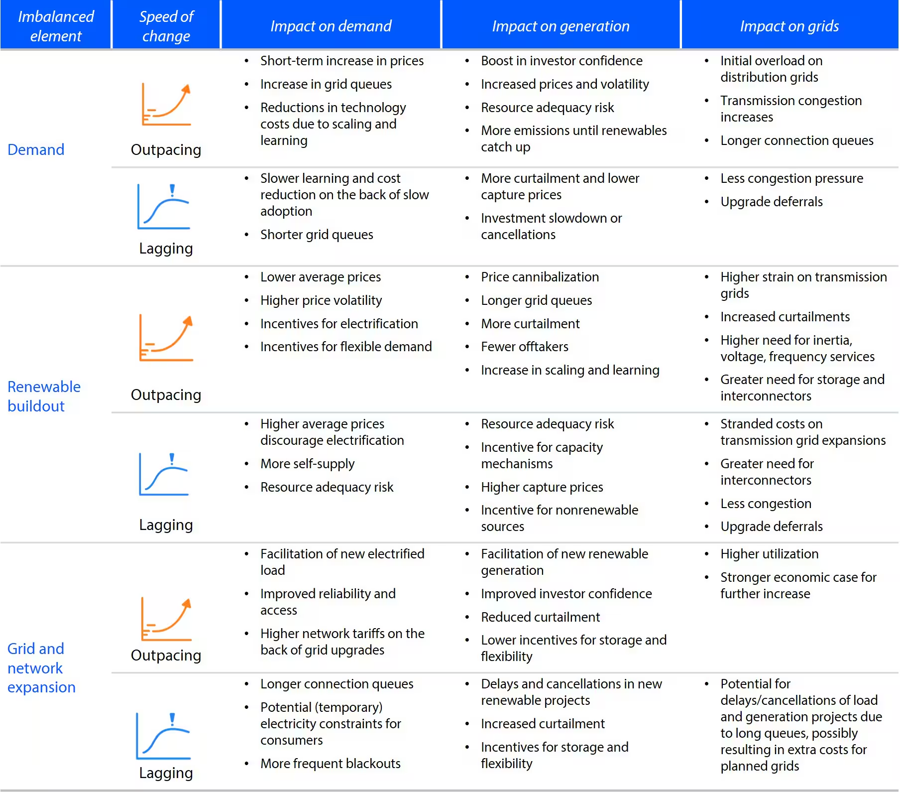 Part of the reason for this is that electrification involves solving a classic chicken-and egg problem. Electricity demand growth, installing additional power generation capacity, and upgrading the grid is highly interdependent. Electrification is a dynamic process in which any element deviating from the ideal risks tripping up the entire system. As the table from Rabobank below illustrates, price volatility is one of the potential knock-on impacts.