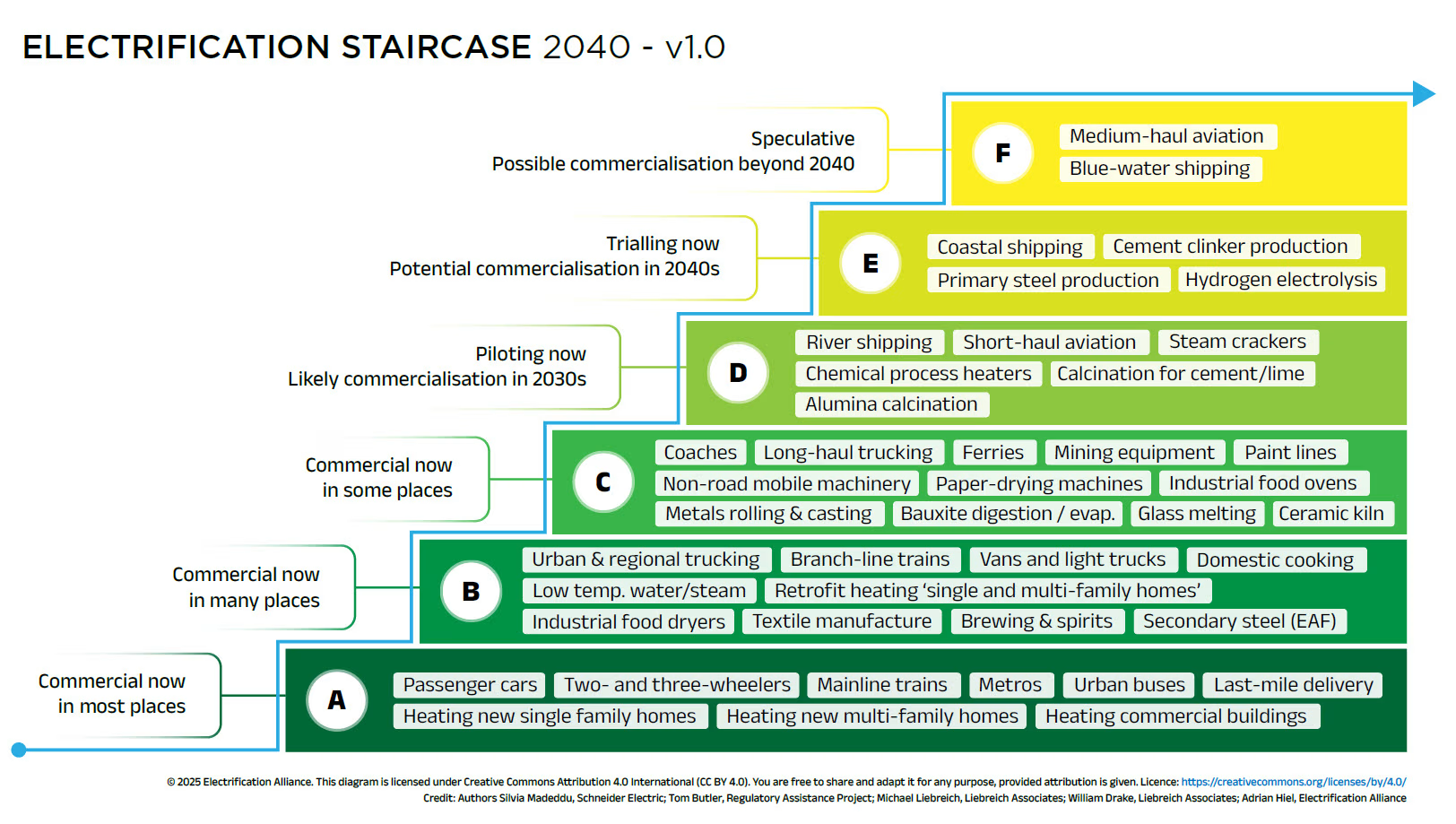 Moving further up the staircase (steps D, E and F) you get to more speculative options that are not at the stage where they are being widely commercialised. For example, coastal and river shipping, short-medium distance aviation, and industrial processes (electrolysis, calcination, etc).