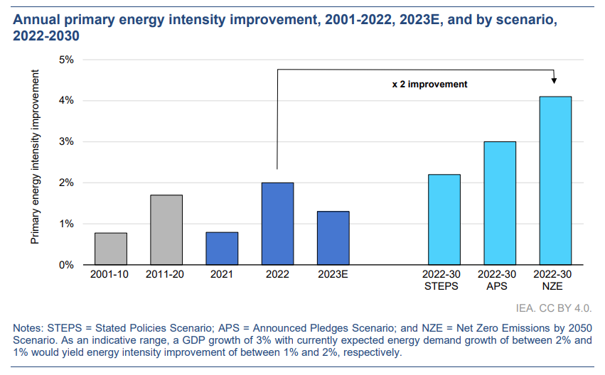How are we doing so far? Well, the annual improvement in global energy intensity - the amount of primary energy used to produce a given amount of GDP - slowed from 2% in 2022 to 1.3% in 2023, according to estimates from the International Energy Agency (IEA). However, to be consistent with the IEA’s Net Zero Emissions by 2050 Scenario, the annual improvement in energy intensity will need to double to 4% across the period 2022-30. The IEA predict that the improvement in energy intensity would result in 7 Gt CO2 lower emissions – 20% of current emissions. Importantly, the IEA indicates that energy efficiency and related measures could account for half of all emission reductions achieved this decade.4