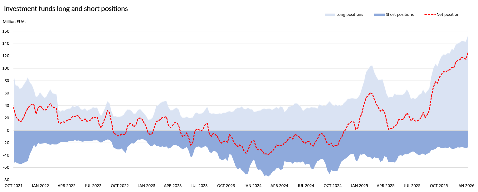The latest Commitment of Traders (COT) report (w/e 9th January) shows that investment funds have continued to add to their net long position, at 125.6 million EUAs its another record high. As we've seen in recent months, the move higher is the result of new long positions. In contrast, net short positions remain stable at around 28 million EUAs. Funds clearly believe the structural tighter balance story will continue in 2026, and maybe into 2027.