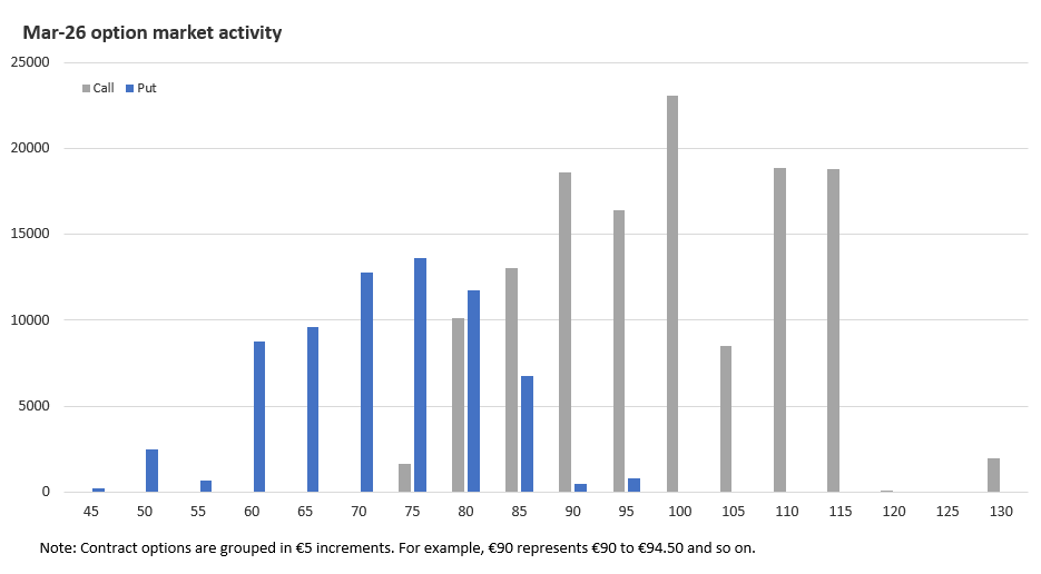 Options market activity for the March 2026 expiry is also hugely bullish. Significant call interest sits above €100 and at 0.52 the put-call ratio is heavily skewed to the bulls. With fund positioning continuing to make fresh records every week calls offer a way of layering in upside optionality without making a direct directional position in the futures market. Overall, the market is signalling that at least in the short-term, EUAs are increasingly likely to push above €100 later this quarter.