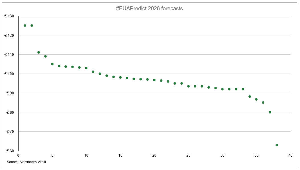 Thank you if you entered the #EUAPredict 2026 competition. The results are now in! The median forecast (based on 38 responses) for the Dec-2026 EUA contract final settlement price was €96.85. The most bullish respondents to #EUAPredict see EUAs ending 2026 at €125, while at the other end of the spectrum, €63 is the most bearish entry received. At the time of writing carbon is trading near €93.