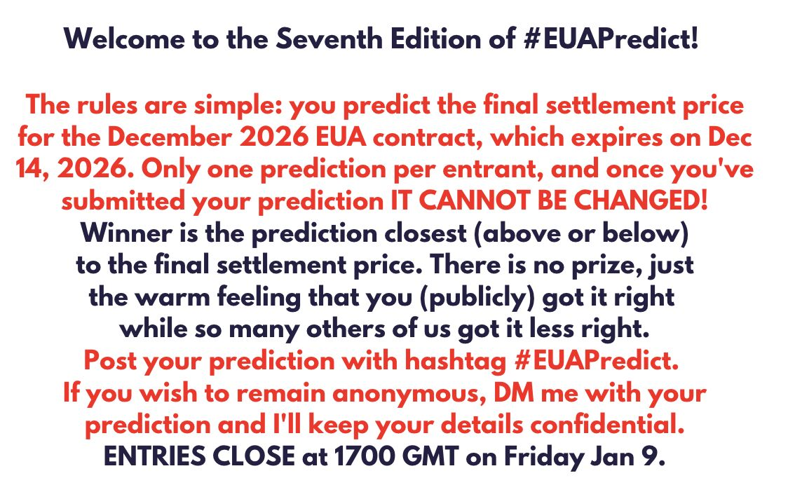 If you think you have something to add you can enter #EUAPredict by posting your end of year EUA prediction on LinkedIn with the hashtag #EUAPredict, or ideally (given the three conditions outlined above) DM Alessandro on LinkedIn with your prediction, or send him an email on alessandro@carbonreporter.com. Remember, entries close at 1700 GMT on Friday 9th January - only three days to go.
