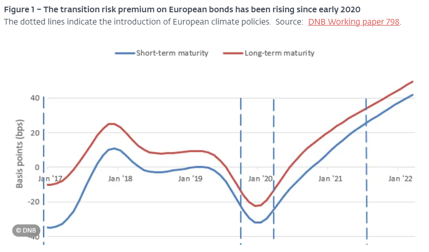 Europe’s most carbon intensive companies pay a premium to borrow compared to firms with lower emissions, according to a report by the Dutch central bank, De Nederlandsche Bank (DNB). The divergence in European corporate bond yields, between high and low carbon intensive firms, has been especially noticeable since 2020 (around the time of the Green Deal and the Fit-for-55 package), with the spread ballooning to over 40 basis points in 2022.1