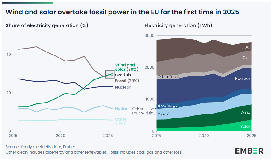 2025 was an historical turning point for the EU's power system. Wind and solar accounted for 30% of the blocs power generation, according to data from Ember, overtaking the 29% generated by burning fossil fuels for the first time. More than half of EU member states (14) saw wind and solar generate more electricity than fossil fuels.