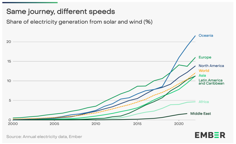 Europe was the first to start on the journey towards high levels of solar and wind generation, it’s share rising to over 15% in 2022. However, it’s no longer the leader. Over the past few years Oceania has overtaken Europe, as capacity in Australia has ramped up. In contrast, Africa and the Middle East remain significantly below the global average, but even there the speed of adoption is accelerating (see In the shade: Europe's solar power does not get the credit it deserves).