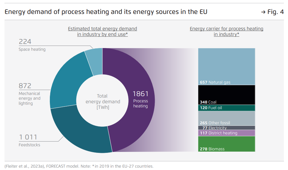 Process heating is the single largest energy use in Europe’s industrial sector, accounting for almost half (47%) of industrial energy demand and three-quarters of industrial CO2 emissions. Fossil fuels account for about 75% of the energy consumed by process heating (primarily natural gas and coal), biomass contributes 15%, while electricity provides a mere 4%!