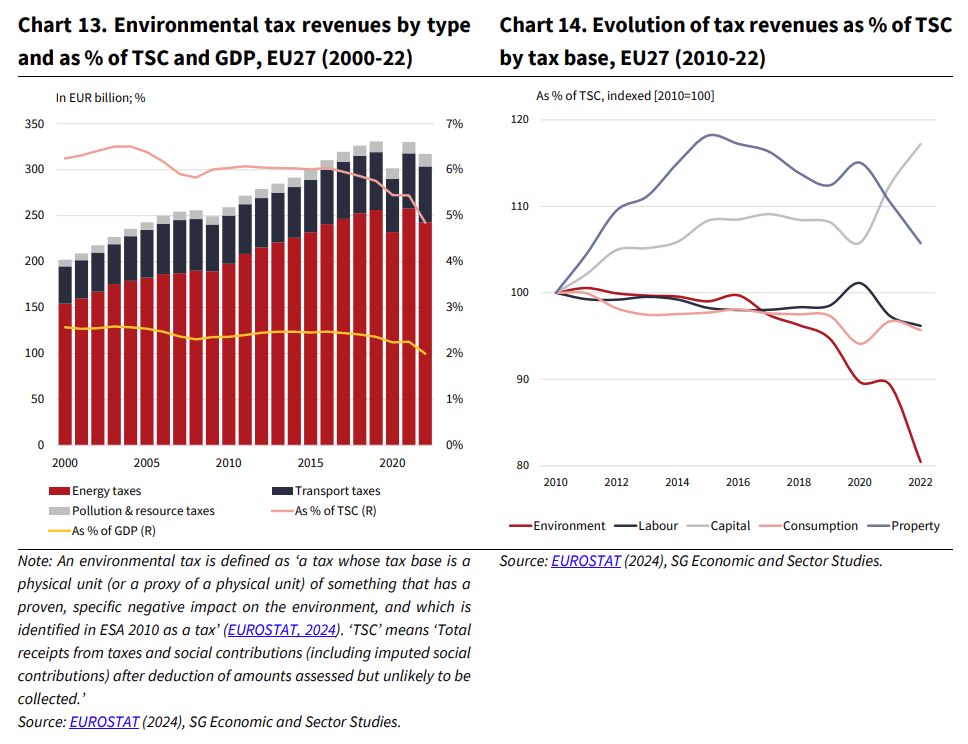 As the activity being taxed declines, revenue raised will naturally erode over time. The decline in the EU's environmental tax take since 2015 reflects the blocs shift away from fossil fuels. The move towards electric vehicles threatens to put a big dent in revenues from fuel duty for instance.