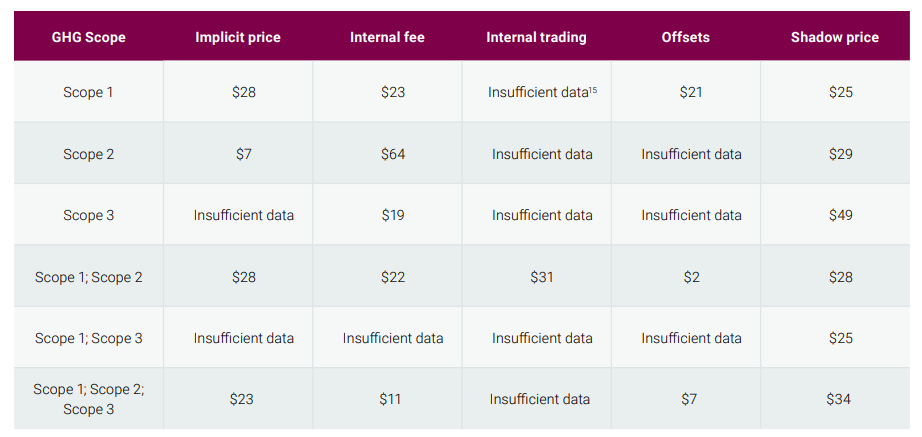 The carbon price used varies significantly across different internal carbon price approaches with shadow carbon pricing typically using the highest value. Firms often use a uniform carbon price, but many also use a different (often much higher) carbon price for other parts of their business operations.
