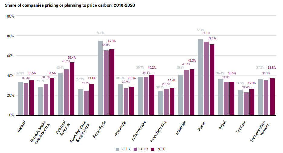 Around two-thirds of fossil fuel and power companies have introduced or are planning on implementing an internal carbon price. That makes sense given their emissions are more likely to be under scrutiny and / or subject to a formal compliance carbon market.