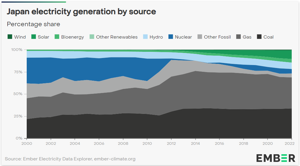 Among its peers, Japan stands out as being unusually reliant on coal, natural gas, and oil to fire its electricity generation plants. Fossil fuels accounted for almost three-quarters of its electricity output in 2022, according to Ember. In comparison, the US, China, and Germany rely on fossil fuels for 56%, 65%, and 32% of power generation respectively.