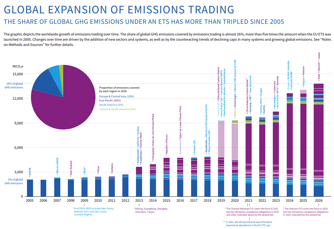 More than one-quarter (almost 26%) of global carbon emissions (equivalent to 14 Gt CO2), are covered by emissions trading systems in 2026, according to the latest ETS status report from the International Carbon Action Partnership (ICAP). Despite the adverse political environment, the share of emissions covered by an ETS climbed 3 percentage points during the past year, while the number of individual schemes increased by 3 to 41.