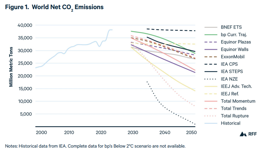 Last week the independent research institution Resources for the Future (RFF) published its annual Global Energy Outlook. The report brings together a range of long-term energy projections from eight organisations, including the IEA, BNEF, BP, ExxonMobil and Equinor. Harmonising 15 projections to "produce as close to apples-to-apples estimates as possible", the report identifies key trends in global energy consumption, emissions (see chart below), and geopolitics.