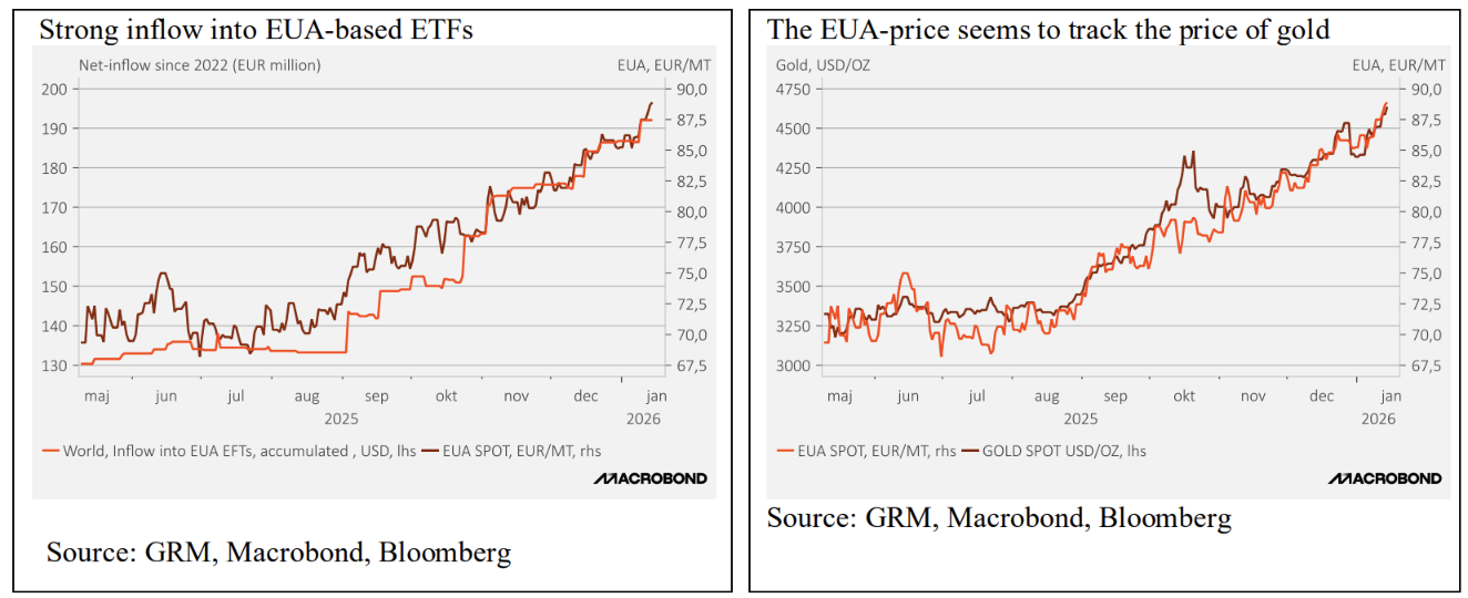 In a sign of the increasing correlation across commodity markets, Global Risk Management (GRM) pondered whether EUAs were now the new gold, noting that "it appears that EUAs have increasingly taken on the role of a safe-haven asset that investors buy as a substitute for gold." Sharing some of the characteristics as gold, GRM note that EUAs are characterised by declining annual supply, the lack of a coupon, and finally, strong credit quality as EU guarantees the system, if not the price. Retail investors have followed hedge funds and gradually increased their allocation to EUA-based ETF's as the price of carbon and gold soared.