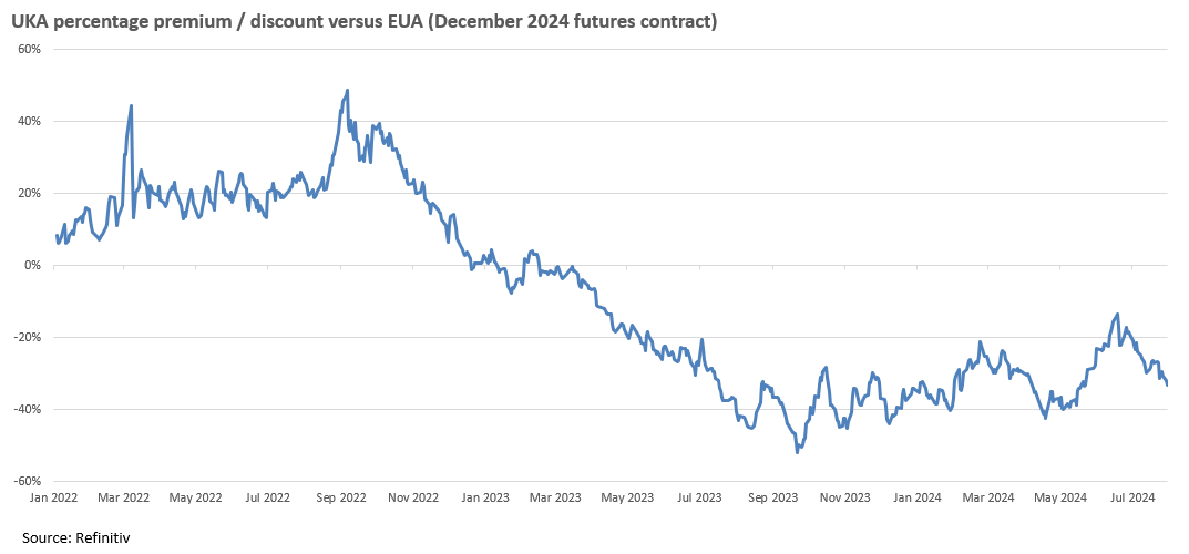 To recap, the UKA percentage discount to the EUA price narrowed from 52% in September 2023 to as little as 14% in mid-June. The prospect of a closer working relationship between the UK and the EU, coupled with the Labour Party’s nod to more ambitious climate policies, helped drive a convergence between the two markets in the runup to the UK general election.