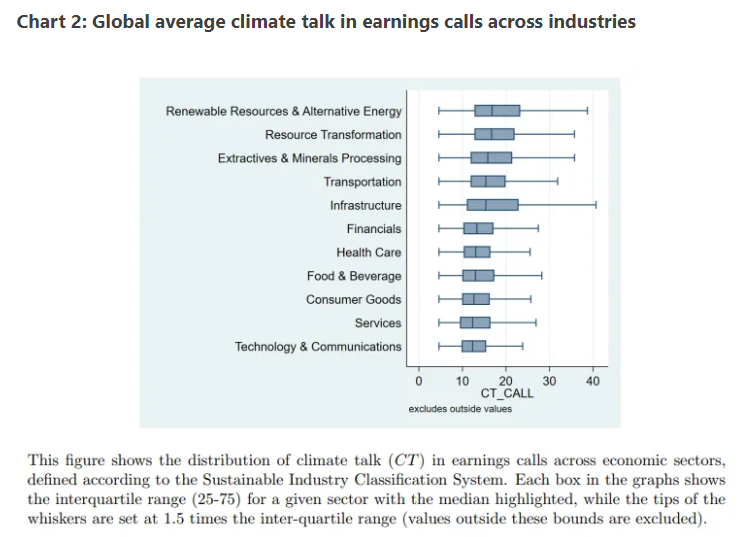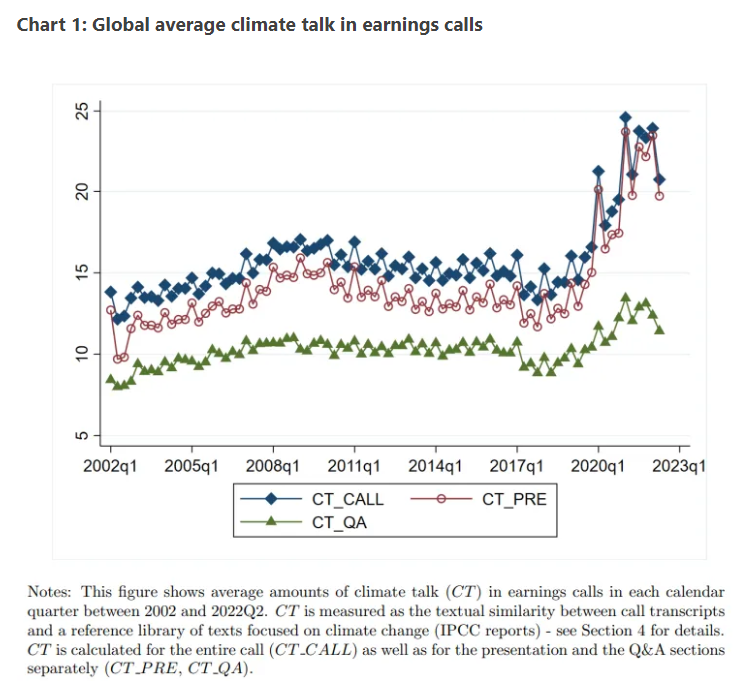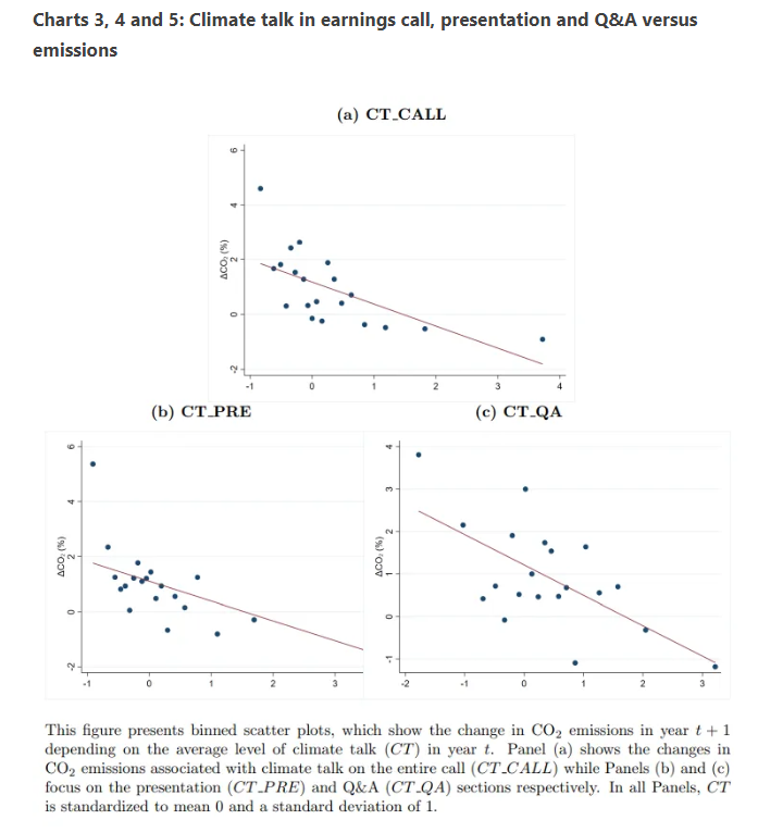 Academics from the Swiss Finance Institute and Stockholm’s Business School and School of Economics compared their corporate climate discussion data with company reported emissions to see if there was a connection. They wanted to answer the question: Do firms with more climate talk in earnings calls reduce CO2 emissions by more (or increase them by less) than companies with less climate talk? In short, is climate talk cheap?3