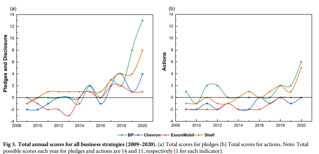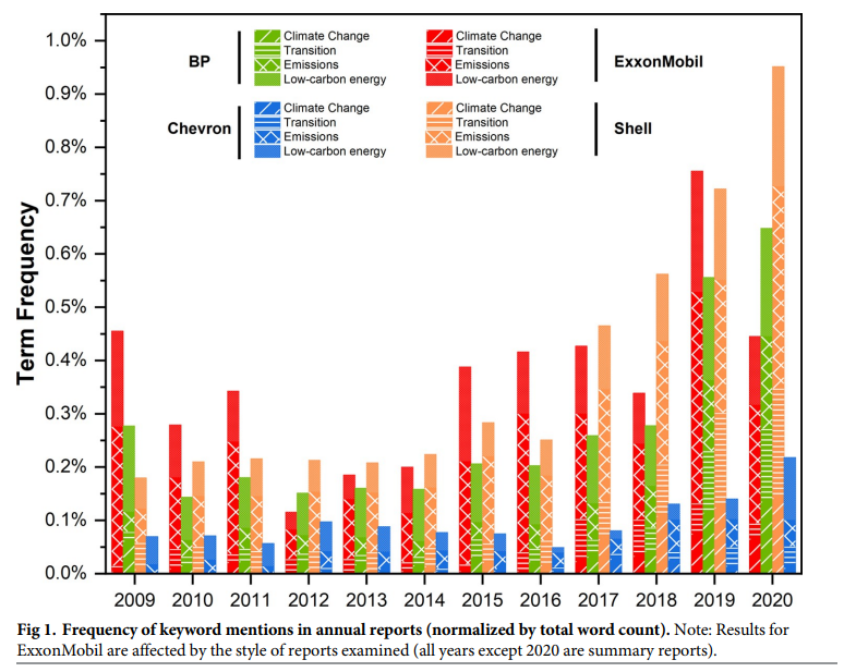 What other evidence is there that climate related words count? Academics at Tohoku and Kyoto Universities set out to investigate the sincerity of the four oil & gas majors (BP, ExxonMobil, Chevron and Shell) by analysing language used in their annual reports and comparing it to the reality of their real-world activities and investment portfolios.4
