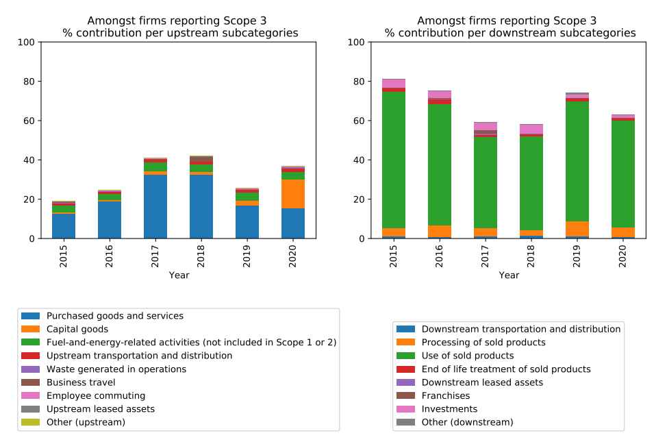 There are a number of sound reasons for this. First, one firm may only measure a certain portion of Scope 3 emissions, while another measures all of it. Second, their interpretation of what is and what isn’t included under Scope 3 may also be different. Without a uniform methodology it is going to be impossible to get consistent results. The charts below demonstrates this well, illustrating how the contribution to upstream and downstream Scope 3 emissions have changed since 2015.