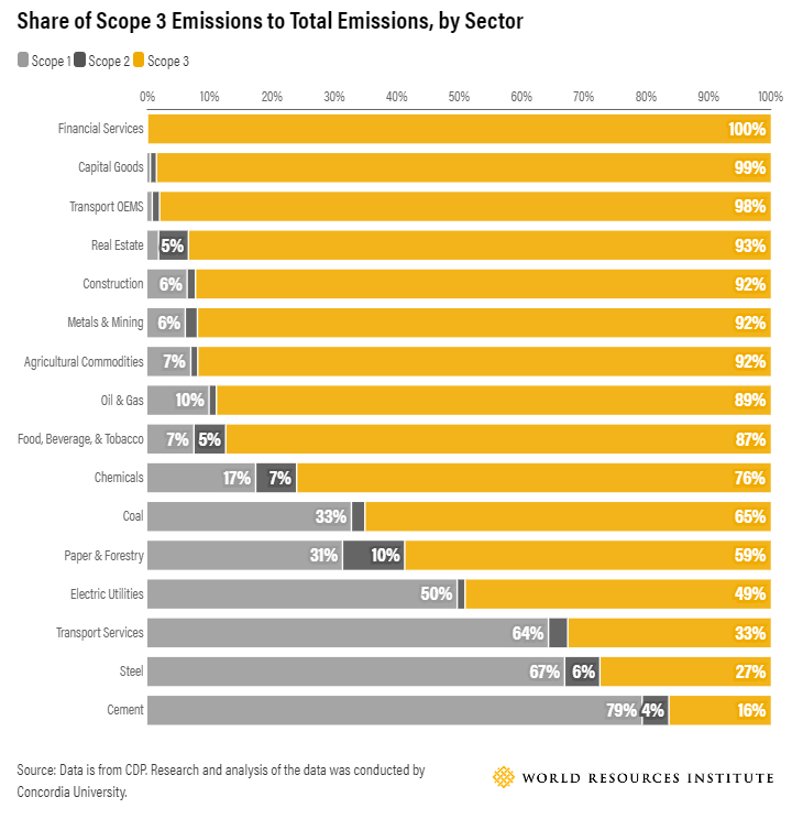 Scope 3 emissions typically account for three-quarters of a company’s emissions, according to estimates from the CDP. However, this varies considerably by sector and can vary from as low as 16% of a company’s emissions for the cement industry, and approach 100% for firms involved with transport, capital goods and financial services.